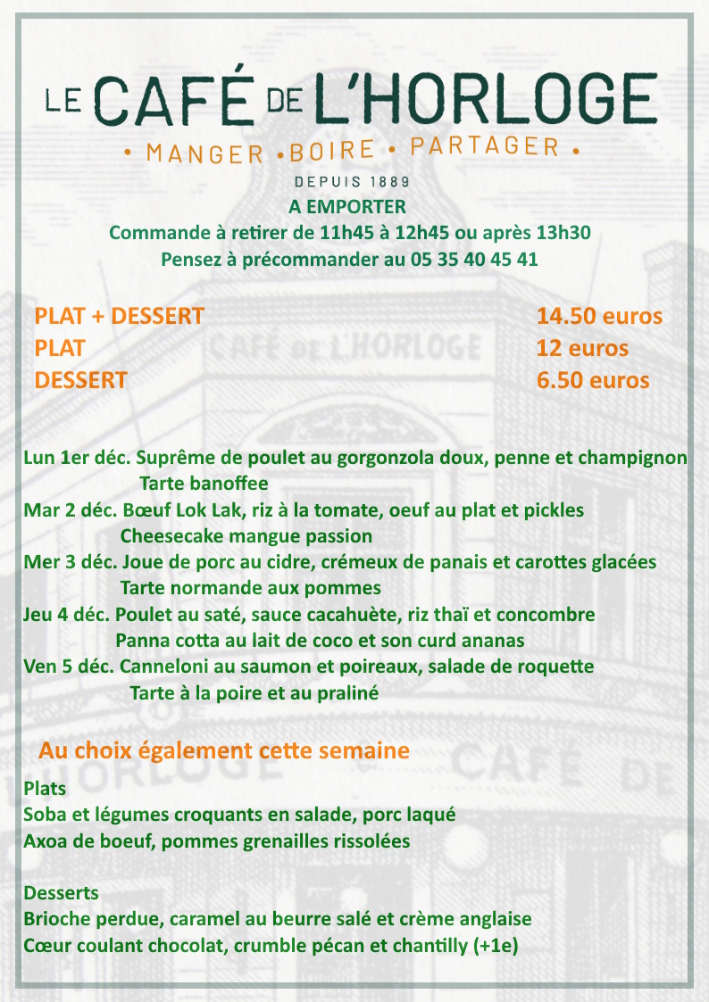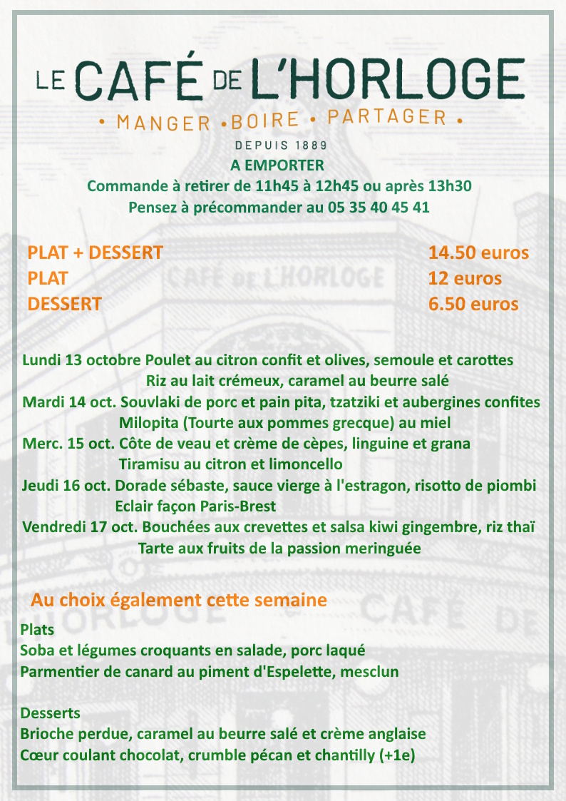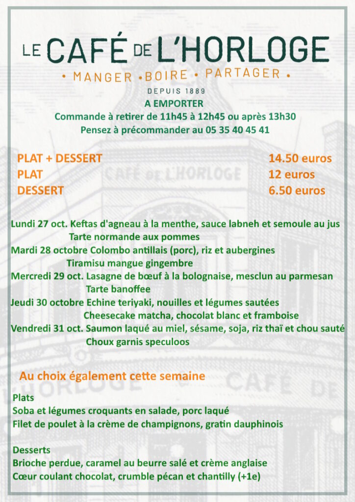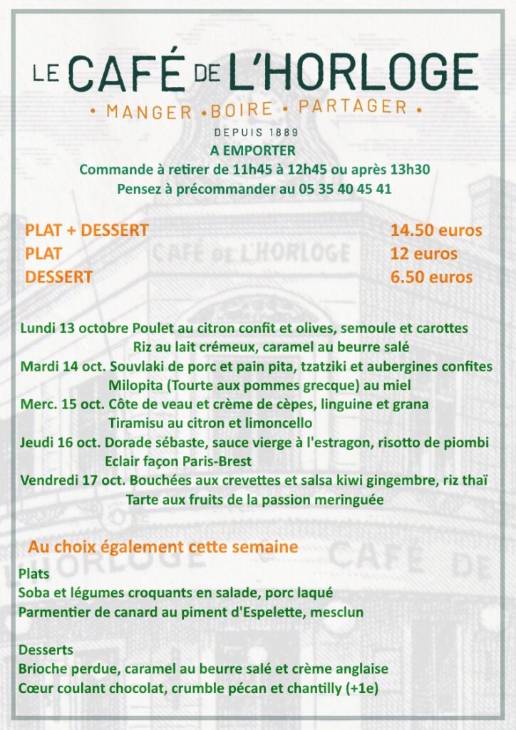 Le Café de l’Horloge vous propose la livraison de vos plats directement chez vous, effectuée par notre personnel.